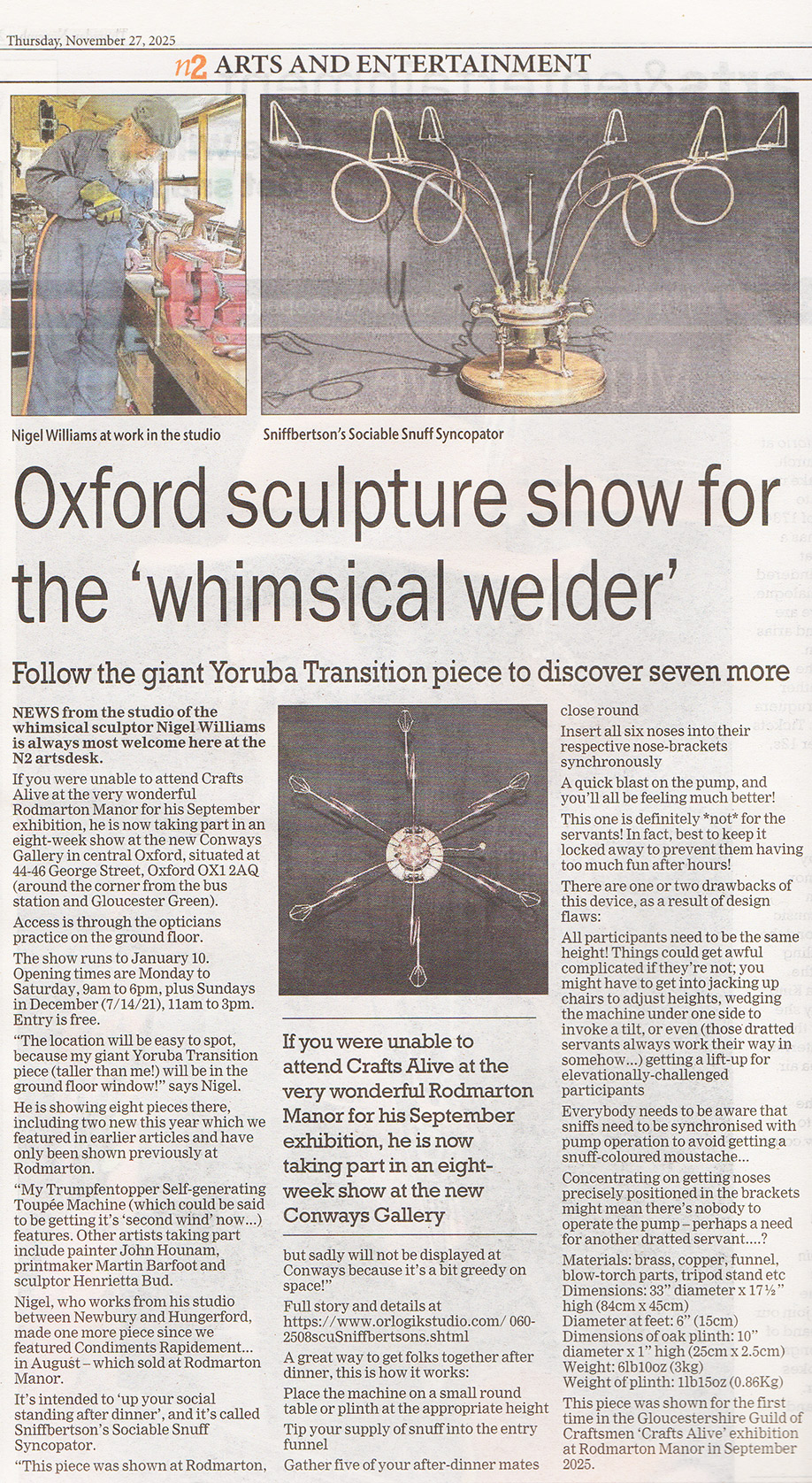 Nigel Williams has been featured on the front page of the Arts & Entertainment section of the Newbury Weekly News yet again, courtesy of the newspaper's Arts Editor Trish Lee, with an article describing Sniffbertson's, as mentioned above, and the exhibition at Conways in Oxford. Read the full article here.